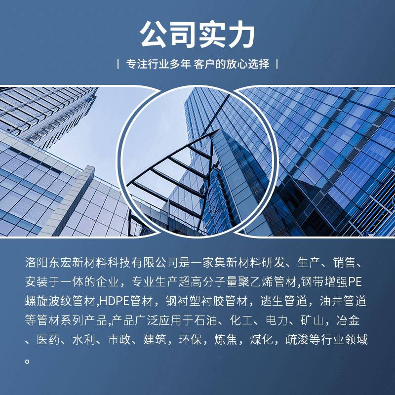 洛陽東宏新材料科技有限公司是一家集新材料研發(fā)、生產(chǎn)、銷售、安裝于一體的企業(yè),專業(yè)生產(chǎn)超高分子量聚乙烯管材,鋼帶增強(qiáng)PE螺旋波紋管材,HDPE管材,鋼襯塑襯膠管材,逃生管道,油井管道等管材系列產(chǎn)品,產(chǎn)品廣泛應(yīng)用于石油、化工、電力、礦山,冶金、醫(yī)藥、水利、市政、建筑,環(huán)保,煉焦,煤化,疏浚等行業(yè)領(lǐng)域。 我公司擁有一支年輕而富有朝氣的營(yíng)銷團(tuán)隊(duì),有專業(yè)的工程師提供整套解決方案,并擁有一套成熟的現(xiàn)代化管理體制。從產(chǎn)品的生產(chǎn)、配送,安裝、調(diào)試以及售后都有一套完整的服務(wù)體系。公司運(yùn)用現(xiàn)代化的管理手段,能夠以好的質(zhì)量、快的速度、合理的價(jià)格為客戶提供高效、優(yōu)質(zhì)、及時(shí)的服務(wù),為客戶的生產(chǎn)和運(yùn)轉(zhuǎn)提供堅(jiān)實(shí)可靠的***和支持。我們有能力也有意愿尋求與客戶共同獲益和成長(zhǎng)的機(jī)會(huì),這也是我們多年以來一直不懈追求的目標(biāo)。 洛陽東宏新材料熱忱歡迎您的考察指導(dǎo)。我們相信,以我們今天的努力一定會(huì)創(chuàng)造我們共同輝煌的明天!選擇東宏,相信您的選擇!